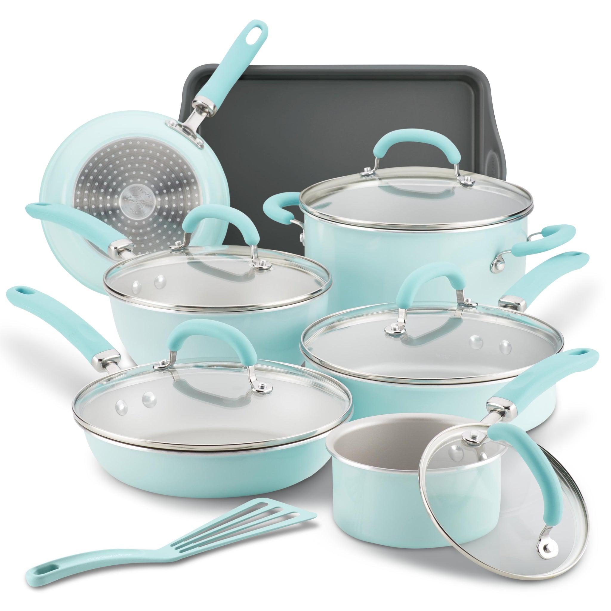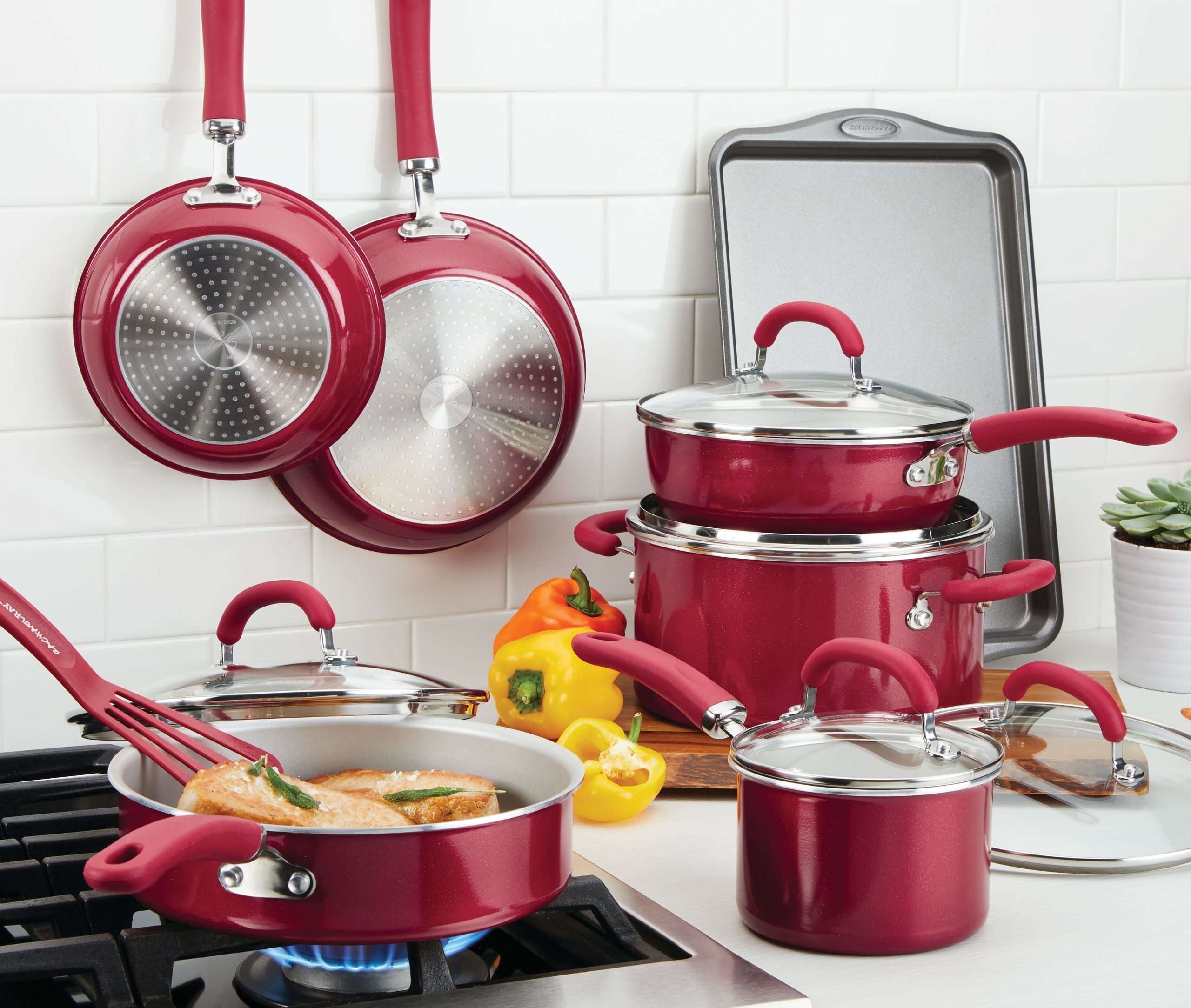 Colorful and solution-oriented. this nonstick induction cookware set brings high performance and easy convenience to home. Made from durable aluminum for ultra-even heating and browning. the pots and pans feature enhanced PlatinumShield Technology for effortless food release and easy cleanup. Suitable for all stovetops. including induction.