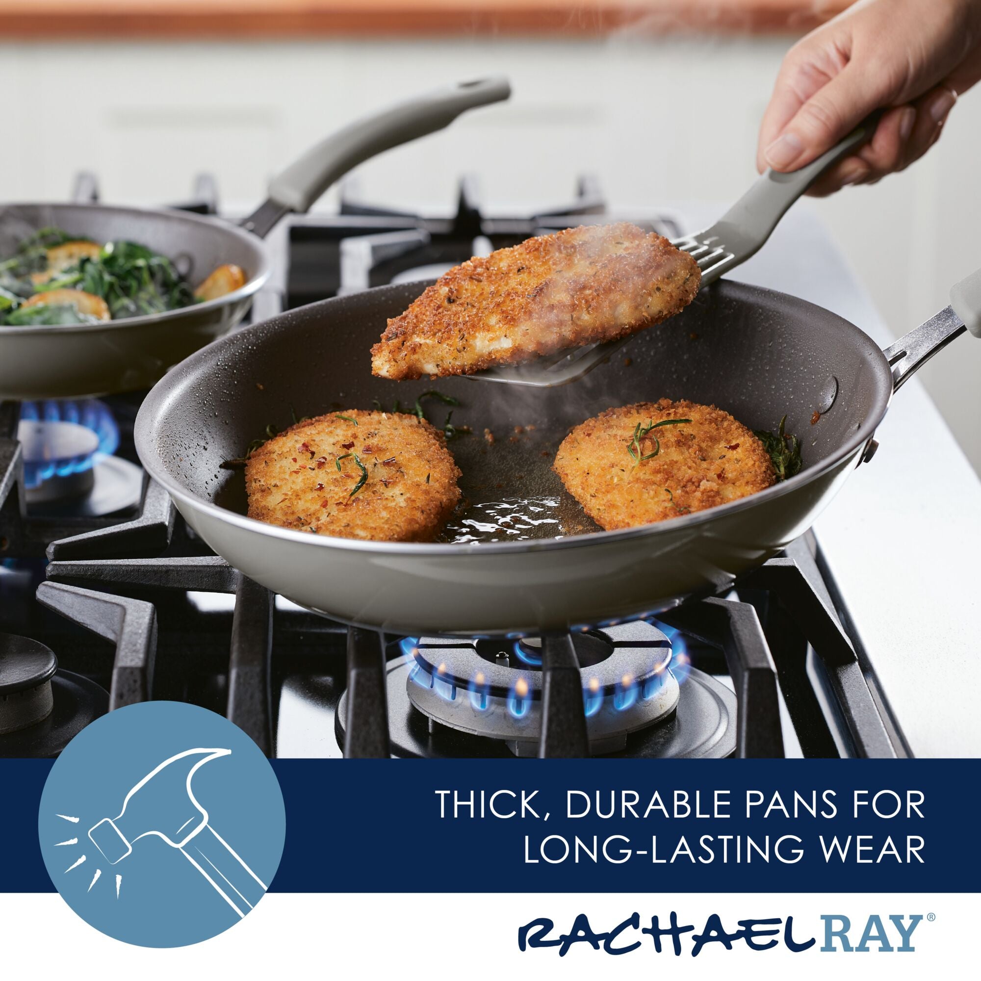 These practical 9.5-inch and 11.75-inch frying pans are crafted from thicker gauge aluminum for a luxe. sturdy feel and reliable stovetop performance that heat up quickly and evenly. Fry pans are finished with high-quality nonstick for effortless food release and easy cleanup.