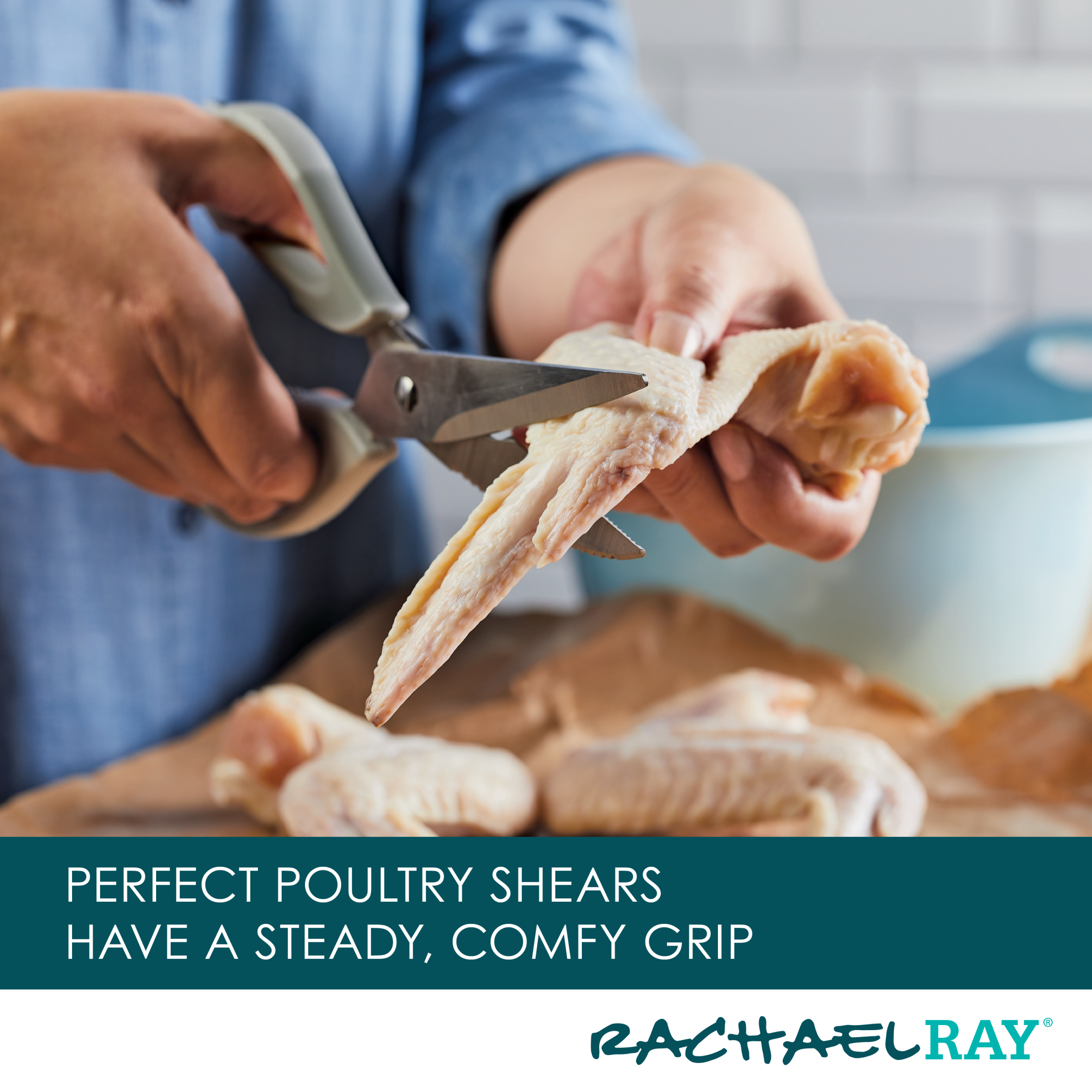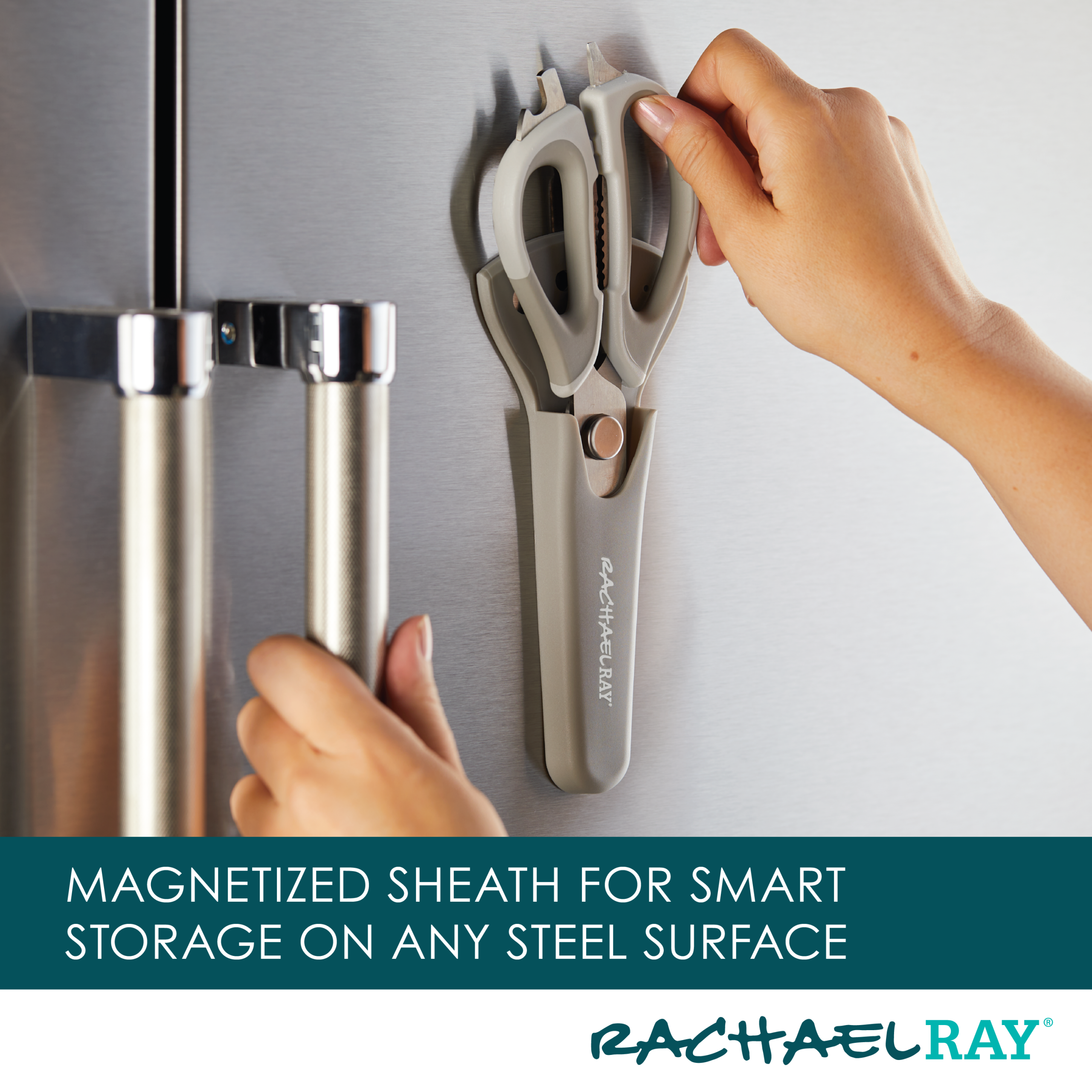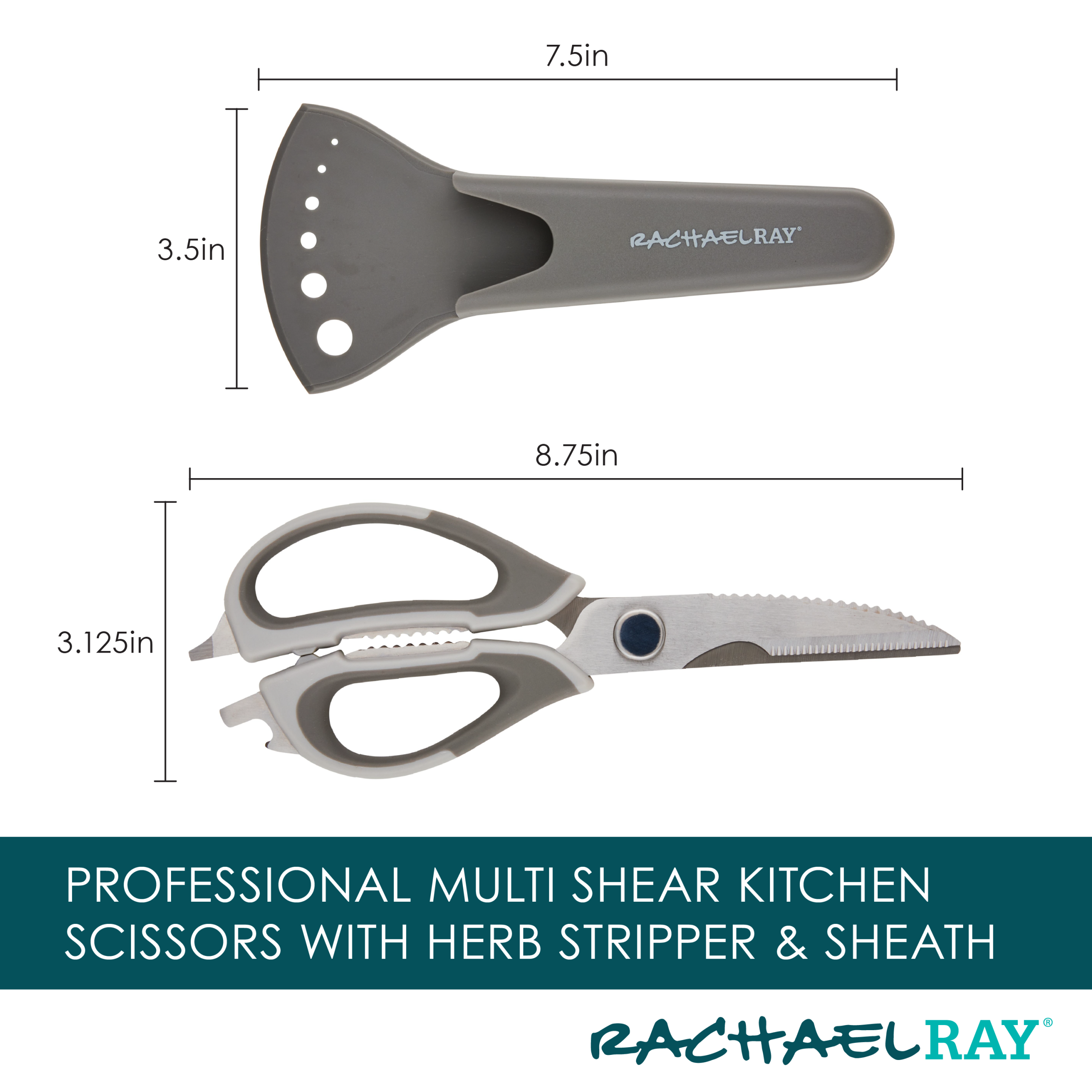 Snip. trim. slice. and strip with these multipurpose kitchen shears from Rachael Ray. A practical design make these prep scissors ideal for a wide range of kitchen tasks. from trimming poultry and meats to cutting vegetables. leafy greens. and even thin sheets of dough or parchment paper. An amazing protective sheath makes for magnet-easy storage on appliances or other steel kitchen surfaces. Japanese stainless steel blades stay ultra sharp for effortless cutting. and the comfy. grippy handles are topped with a convenient bottle opener and screwdriver. The sheath features six graduated stripping holes for quickly removing thyme. rosemary. cilantro. and kale leaves from their stems. plus the heavy duty shears separate easily into two pieces for use as a fish scaler or scraper and pop right in the dishwasher for easy. spotless cleanup.